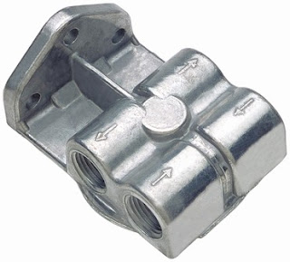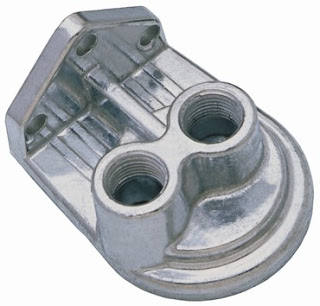 I began lowering the motor into the 944s engine bay last weekend. Well the farther you lower it the more items you have to remove. It is currently in position and bolted to the torque tube. I think that if you made allowances with wiring and plumbing it would be possible to change a clutch in the future by moving the engine forward instead of the fiasco that occurs on a stock 944. There is a large amount of room in front of the motor compared to the original engine. So on to the topic of this post. You will find that the oil filter will land right on the top of the steering rack. Aah crap...that's what went through my mind. So I removed the filter and lowered it to the right height. While there isn't enough room for the stock filter there does appear to be room for a part made by Trans Dapt. The part number is 1413. They call it a 90 degree oil bypass adapter. Here is what it looks like.
