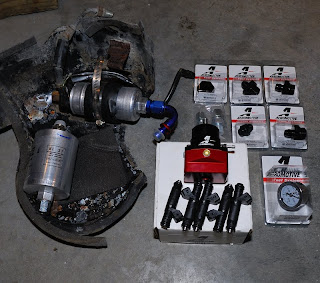 Here is a picture of most of the fuel system parts. You can see the 044 pump, new filter, deka 4 630cc injectors, aeromotive AFPR, and other associated parts. Not pictured is the fuel rail (still waiting for it to be made), tank filter (already installed), and some hoses and fittings (waiting on the rail so I get the right parts). You can see the AN 120 degree elbow on the end of the pump that adapts the pump to the tanks line size.